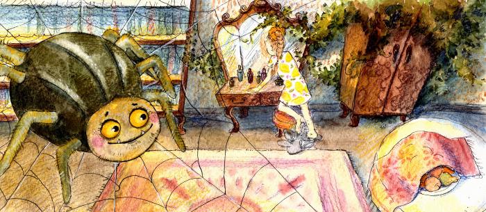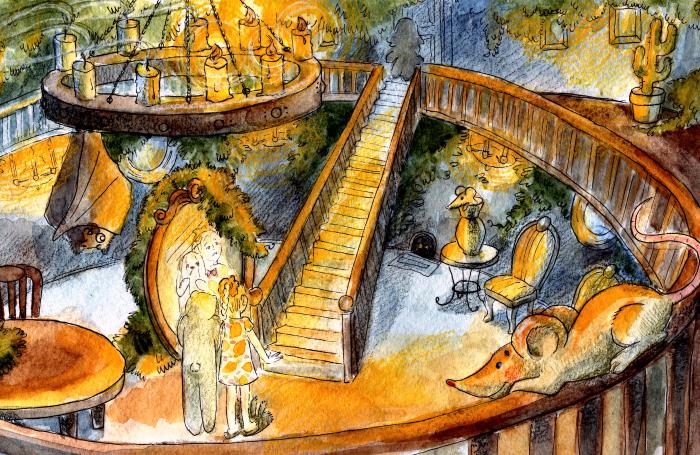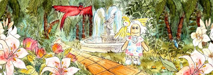 После знакомства хозяева предложили нашим друзьям экскурсию по дому. Васёна очень этому обрадовалась, ведь ей нужно было поискать дорогу к родителям. Компания поднялась на верхний этаж, и там оказалась прекрасная оранжерея под стеклянным куполом. Диковинные деревья, кустарники и цветы жили в доме призрачного семейства и были окутаны любовью и заботой. В саду жили тряпичные птицы, которые спели гостям волшебной красоты песни, а в центре оранжереи блестел и сиял голубой прозрачной водой красивый бассейн с фонтаном. Очень было удивительно обнаружить такую красоту в старом покосившемся особняке.