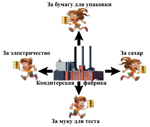 А фабрика тоже и продавец, и покупатель. Для того чтобы сделать пирожное, она многое должна купить. Ту же электроэнергию, чтобы работали станки, картон или бумагу для упаковки пирожных, сахар для добавки в тесто, чтобы пирожное было вкусным, и еще массу всяких ресурсов. Фабрике надо было бы иметь для этого специальных людей, которые бы принимали деньги, хранили их, складывали в мешки и чемоданы, развозили бы по тем фирмам, у которых фабрика что-то покупает. А если эти фирмы находятся в других городах? Тогда уж совсем неудобно разъезжать туда-сюда с мешками денег.