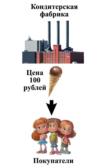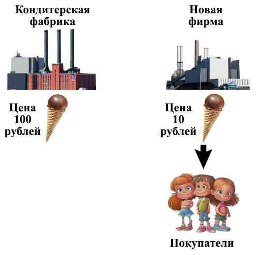 Но вот на вкусном рынке появилась еще одна фирма. Для того чтобы привлечь покупателей, она сделала цену на пирожное меньше, чем у кондитерской фабрики. Это уже начало конкуренции.