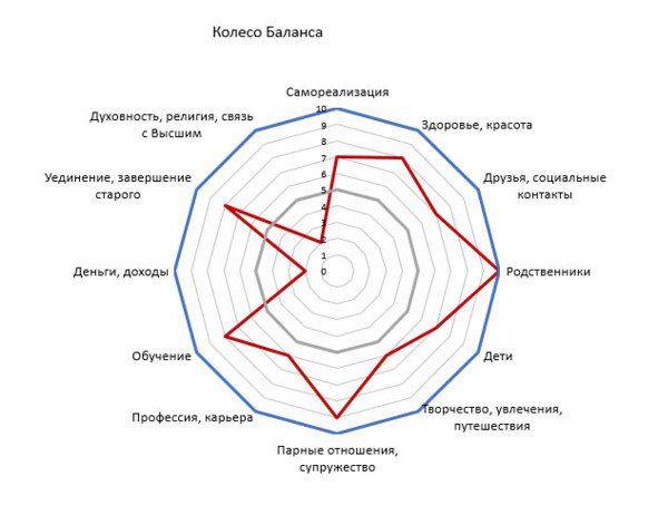 Работа с «Колесом баланса» проводится в начале или в конце года, когда нужно запланировать основные направления развития и события на предстоящие 12 месяцев. Состояние сферы оценивается от 1 до 10, где 1 наименьшее развитие, 10 все в полном порядке. Для наглядности точки, полученные на Колесе, можно соединить прямыми (см. рис.) или закрасить сектора разными цветами. Так можно увидеть, насколько Колесо (а значит, и ваша жизнь) гармонично. Покатится ли оно? Это не значит, что все сферы всегда должны быть «на десятку». Они динамичны. Но нужно стремиться к тому, чтобы Колесо было более ровное.