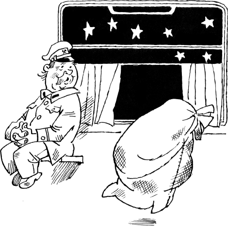 И через несколько минут Солнышкин, согнувшись в собственном мешке, въезжал на матросской спине в двери вагона.