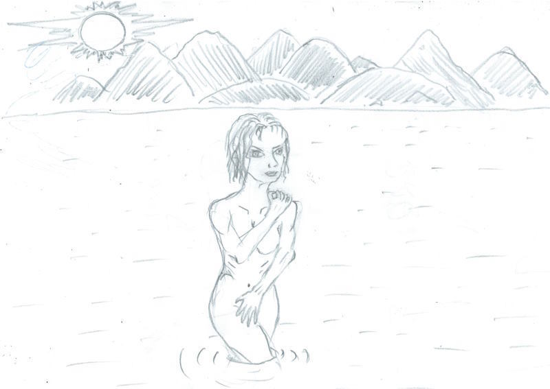 Он вскочил со своего места и направился к ней. Та стояла недалеко в воде где-то по пояс, может ниже. Подойдя ближе он заметил короткие чуть вьющиеся растрёпанные светлые волосы, большие голубые или синие глаза. Темные линии кровеносных сосудов на лице проступали как бы сквозь нее на солнце. «Господи, да она вся просвечивается, как на рентгене!». Фигурка девушки была совсем тонкой и невысокой, даже мелкой. Завидев Брода, она застенчиво спрятала наготу ладонями рук, однако Брод все равно заметил узоры из тонкий капилляров исходящих от ее сосков. Он приблизился еще, и она как будто узнала его, улыбнулась и сказала ласковым подобно журчанию горного ручья голосом: