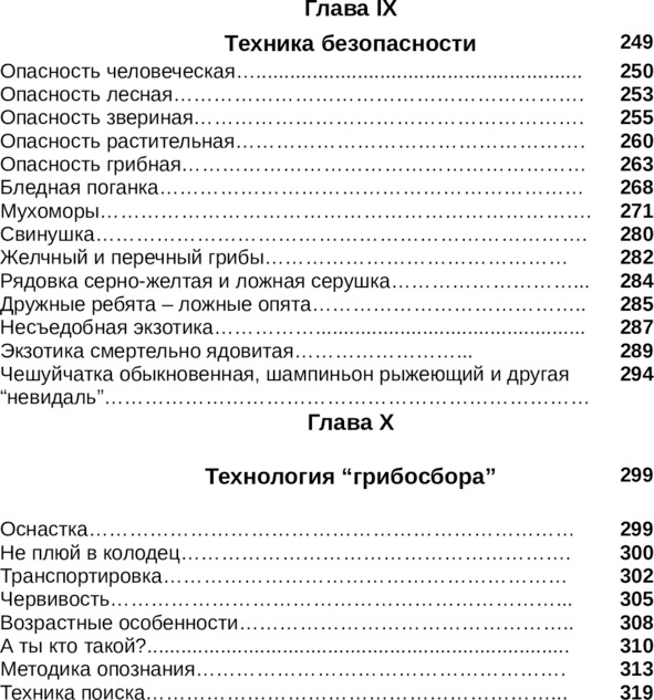 Кроме рассказов о несъедобных и ядовитых грибах, в той же главе описаны возможные неприятности и опасности, с которыми может столкнуться грибник, а также способы защиты от них, проверенные за время сорокалетней практики.