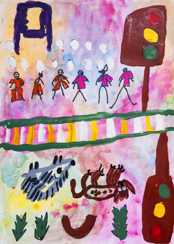 Бегут ёжик Пушистик и щенок Петька и видят много людей с разной строительной техникой. Всё гремит, шумит. Страшно! Спрятались Пушистик и Петьяка в кустах, сидят и дрожат. А люди ходят, провода тянут, какой-то прибор на столб прикручивают и приговаривают: «Светофорчик-светофор, вам дорога в новый двор!».