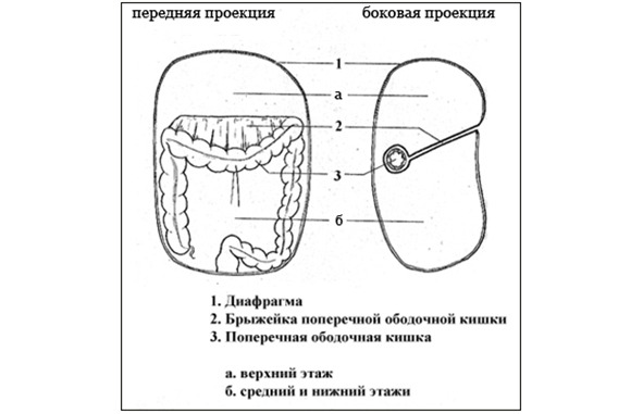 Верхний этаж (эпигастрий) ограничен сверху диафрагмой, снизу брыжейкой поперечной ободочной кишки.