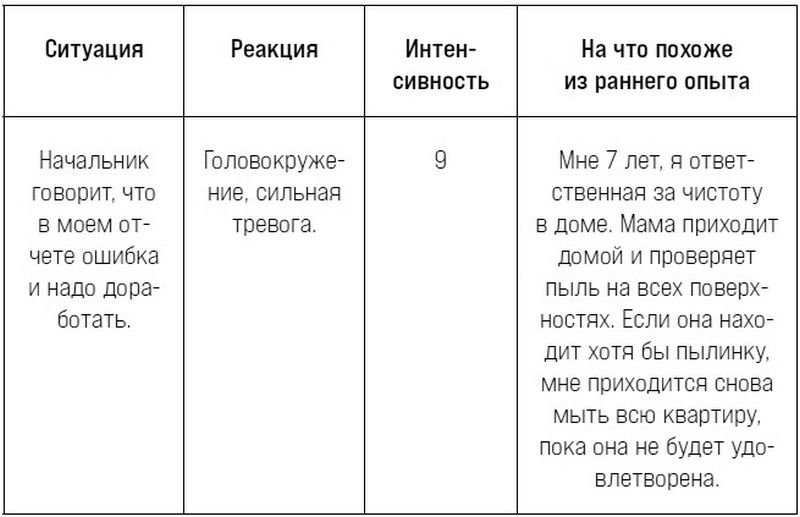 2. Затем эти ситуации необходимо проанализировать. Можно использовать таблицу, в которой будут следующие столбцы: «описание ситуации», «описание вашей реакции», «интенсивность реакции от 0 до 10». В последнем столбце я предлагаю вам, используя вопрос «когда я уже была в схожей ситуации и испытывала схожие чувства?», записать наиболее ранние воспоминания.
