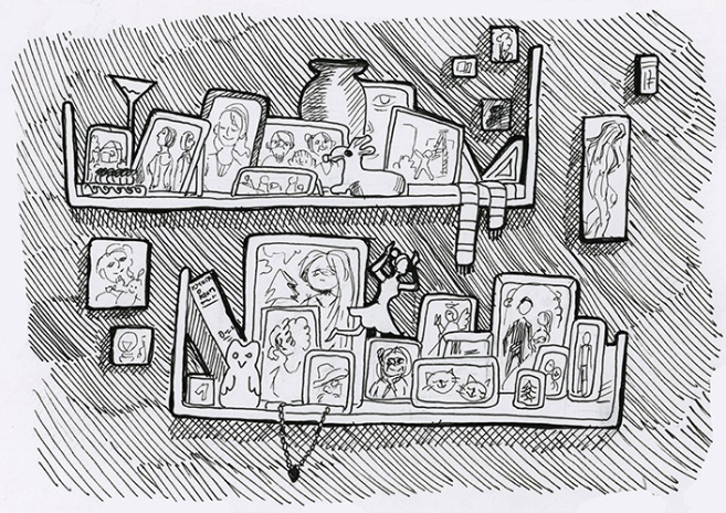 Жаль, что не только его там же стояли рядами в деревянных и пластиковых рамках ещё десятки чужих фото, наползая друг на друга, как костяшки домино. Меж них теснились нэцке, пыльные статуэтки кроликов и балерин. Лежали стопками браслетики.