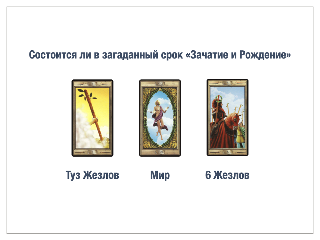В данном случае карты указывают на аборт, туз жезлов зачатие, а Мир в паре с шестеркой жезлов говорит о завершившемся цикле, рождение ребенка не реализовано, прервано на середине развития жизни плода. Почему на середине цикла? Потому что карта Мир, упала по середине, если бы она упала третьей картой, то можно было бы сказать, что женщина родит в срок. Почему в данном примере мы ориентируемся на карту Мир, потому что это СА, а старшие арканы просматриваются в первую очередь так как имеют большой вес, недаром они называются старшими и плюс мы смотрим соединение карт.