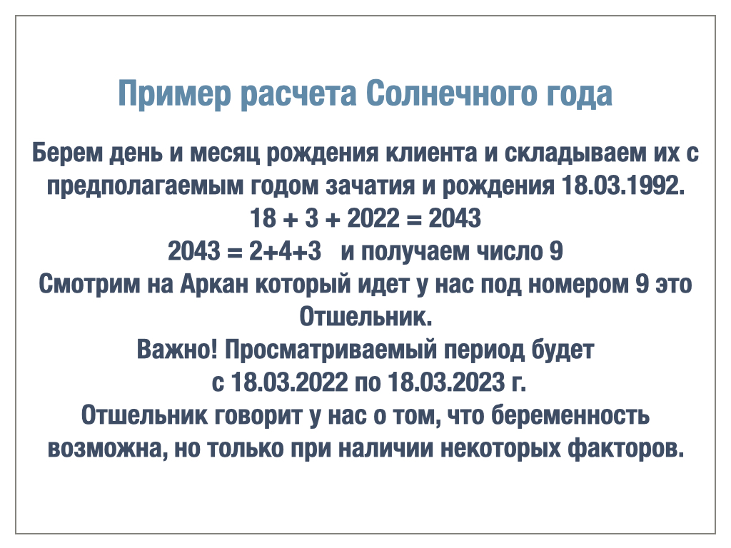 С помощью нумерологии Таро, вы можете определить благоприятный и неблагоприятный год для зачатия и рождения ребенка. А также проверить правильность своего расклада. Эта система называется: "определение солнечного года для зачатия и рождения". Для того чтобы вычислить благоприятный год нужно сложить цифры дня и месяца рождения с интересующим нас годом.