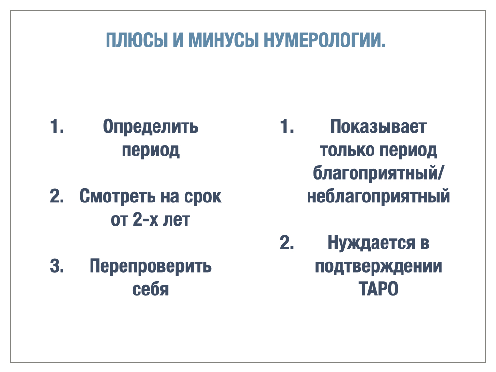 Плюсы и минусы нумерологии. Плюсы в том, что к примеру женщина не знает на какой год, она хочет посмотреть рождение ребенка и мы можем просмотреть все ее ближайшие года, вплоть на 30 лет вперед, и увидев благоприятный год, мы можем на Таро его просмотреть. Второй плюс это то, что смотреть можно на срок от двух лет. А также перепроверить свой расклад.