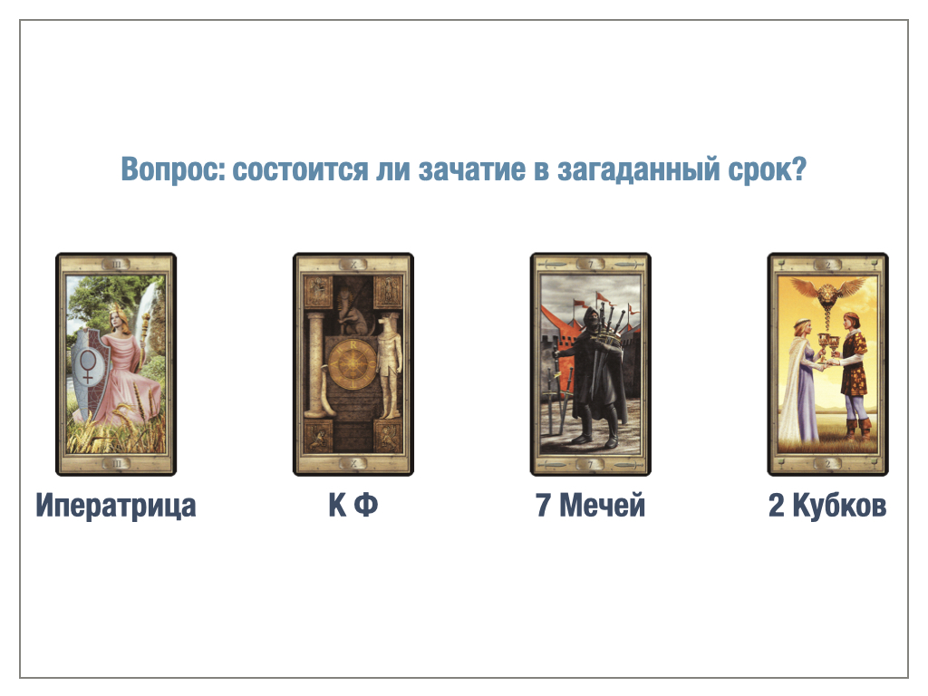 3. Разберем еще краткий расклад. Состоится ли зачатие в загаданный срок? По данному раскладу, зачатие в загаданный срок состоится. Многие бы обратили внимание на Колесо Фортуны, но оно стоит в сочетании с Императрицей, а это значит успешное зачатие в нужный момент, в нужное время, прямое попадание в цикл. Семерка Мечей это что-то скрытое. И исходя именно из вопроса, речь идет о скрытом зачатии, женщина не сразу обнаружит свою беременность, но по Колесу Фортуны это к лучшему. Семерка Мечей и Двойка Кубков это безответственное поведение, которое может навредить беременности. Кстати, очень часто на вопрос о беременности, выпадает Семерка Мечей (она показывает ранние сроки, когда женщина еще не знает, что она беременная). ОС беременность и рождение ребенка состоялось. Для девушки это было неожиданно.