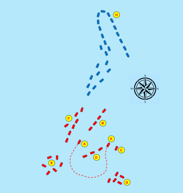 К юго-западу от этих двух групп стояло несколько других кораблей (на плане «Е»), находящихся в разной степени беспорядка: одни шли по курсу, другие пытались повернуть за авангардом, третьи были полностью выведены из строя. В частности, на юге находилась группа из пяти британских кораблей, явно неспособных к маневрированию (на плане «G»).