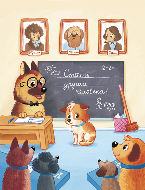 Тим робко вошёл в класс и осмотрелся. В классе было светло и просторно. Здесь помещались шесть парт, учительский стол и портреты известных собак над доской. Но всё, что увидел Тим за пару мгновений, это одиннадцать блестящих носов, и каждый нос принюхивался к нему. Тим поёжился.