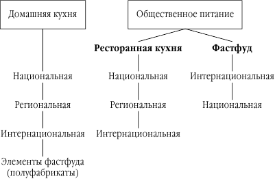 Из приведенной схемы видно, что разные виды кухни трудно четко разграничить; они взаимопроникающие. Национальные блюда готовят с успехом дома обычно в соответствии с традициями семьи, причем если семья состоит из представителей разных народов, то вполне естественно употребляются блюда различной национальной кухни. В отличие от домашней кухни рестораны обычно придерживаются какой-либо одной национальной кухни. Лишь в последние десятилетия наряду с национальными предлагаются блюда европейской кухни, что связано и с туристическим бумом, и с процессами миграции народов.