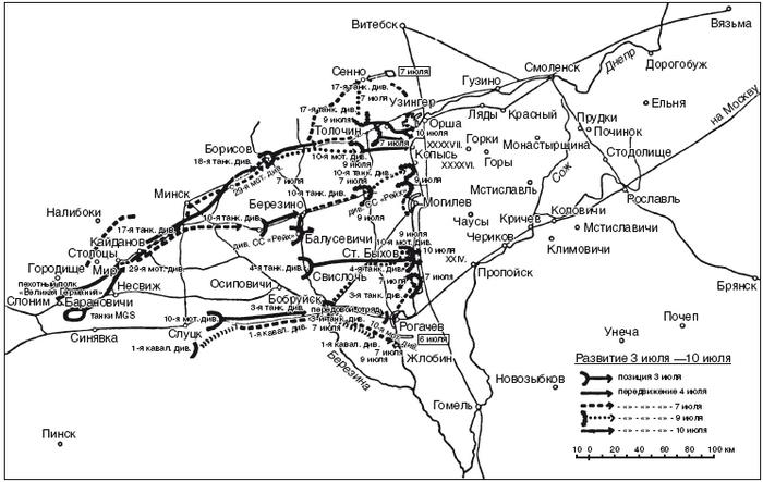В первую неделю июля на общем фронте группы армий «Центр» дело дошло до тяжелых и затяжных сражений, во время которых приходилось сдавать врагу ранее завоеванные нами земли. В конце концов, благодаря гибкости руководства, превосходству военной техники и боевому опыту солдат немецкие формирования победили. Путь вперед продолжался!