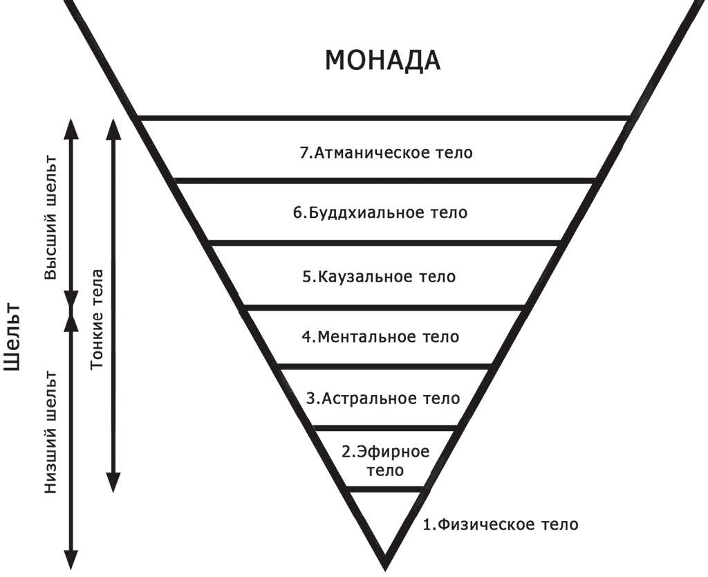 Физическое, эфирное, астральное и ментальное тела принадлежат к низшему шельту (рис. 2), который распадается после смерти человека.