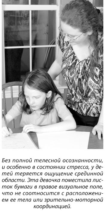 Поскольку вся зрительно-моторная деятельность происходит в зоне срединной области, детям полезно выполнять упражнения для обеих рук, дабы открыть для себя эту зону централизации. Они должны освоиться с работой в срединной области до того, как им придется пользоваться глазами для чтения слов навыка, нелегко дающегося тем, у кого пока не выработались устойчивость (центрирование) или визуальное совмещение. Когда глаза работают в тандеме, ученик развивает глубинное восприятие, работая в визуальной срединной области важнейшей зоне для развития навыков игрового манипулирования мелкими предметами, а позднее чтения и письма.