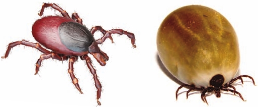 Голодный и напитавшийся кровью собачий клещ (лат. Ixodes ricinus).