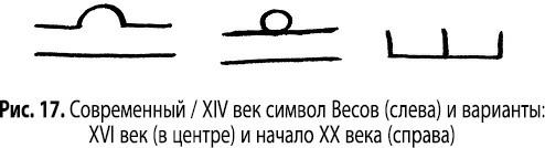 Древние люди отождествляли Весы с богинями справедливости точно так же в наши дни энергию этого созвездия можно призвать для помощи в решении юридических вопросов или просто для восстановления справедливости. Начертите символ Весов (рис. 17) на изображении календулы и сожгите этот листок в котле, одновременно визуализируя благоприятное для вас разрешение вашей ситуации. В качестве альтернативы можно нарисовать символ красками на кусочке нефрита и носить этот минерал с собой на встречу с адвокатами или при обращении в суд. Чтобы гармонизировать домашнюю атмосферу, нарисуйте знак Весов красками на нескольких кусочках двухцветного агата, а затем разместите эти камни в тех частях дома, где собирается ваша семья. Напишите этот символ на розовой или лавандовой свече и используйте ее в приворотах. Созерцайте его, если очень хотите добавить в свою жизнь любовь и секс.