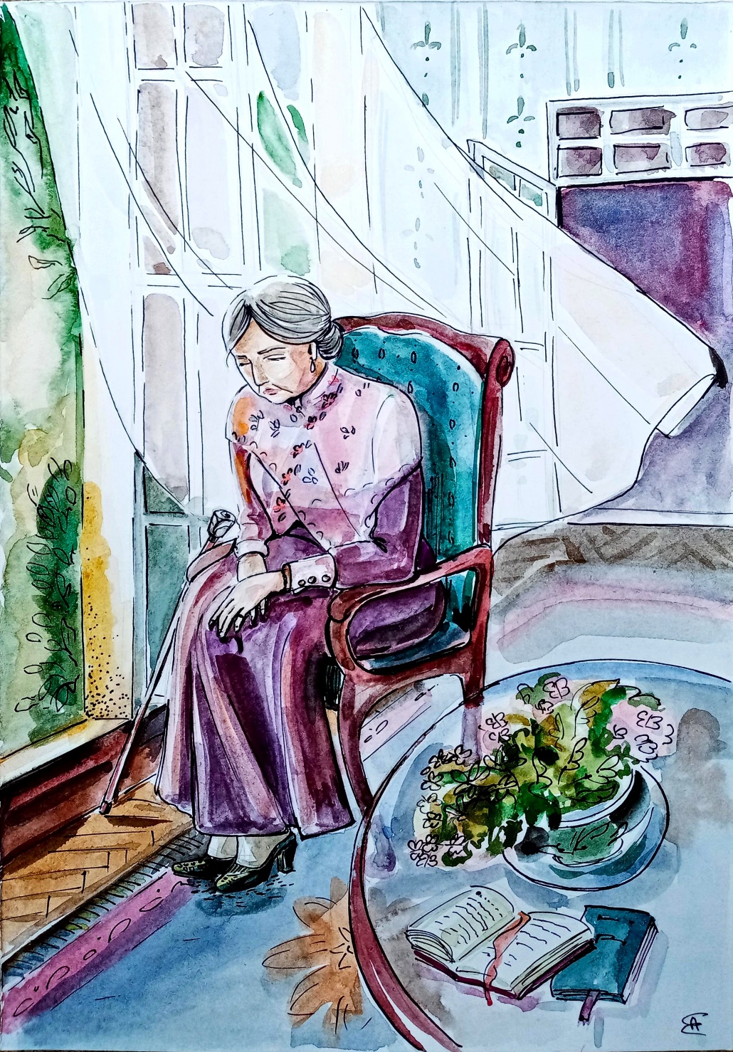 Утром, приоткрыв спросонья глаза, Марко сначала подумал, что находится среди облаков, однако, немного погодя, он понял что принял за них колыхающуюся тюль занавесок. Также мальчик обнаружил, что был завернут в несколько теплых одеял и не без труда освободившись из их плена, тихонько встал. Около него в красивом резном кресле сидела старая женщина. Она была одета в длинное старомодное сиреневое платье, а ее седые волосы были убраны в аккуратный пучок. Рядом с креслом стояла изящная тонкая трость с серебряным набалдашником в виде розы. Женщина тихо спала, и Марко на цыпочках прошмыгнул мимо нее в открытую дверь.