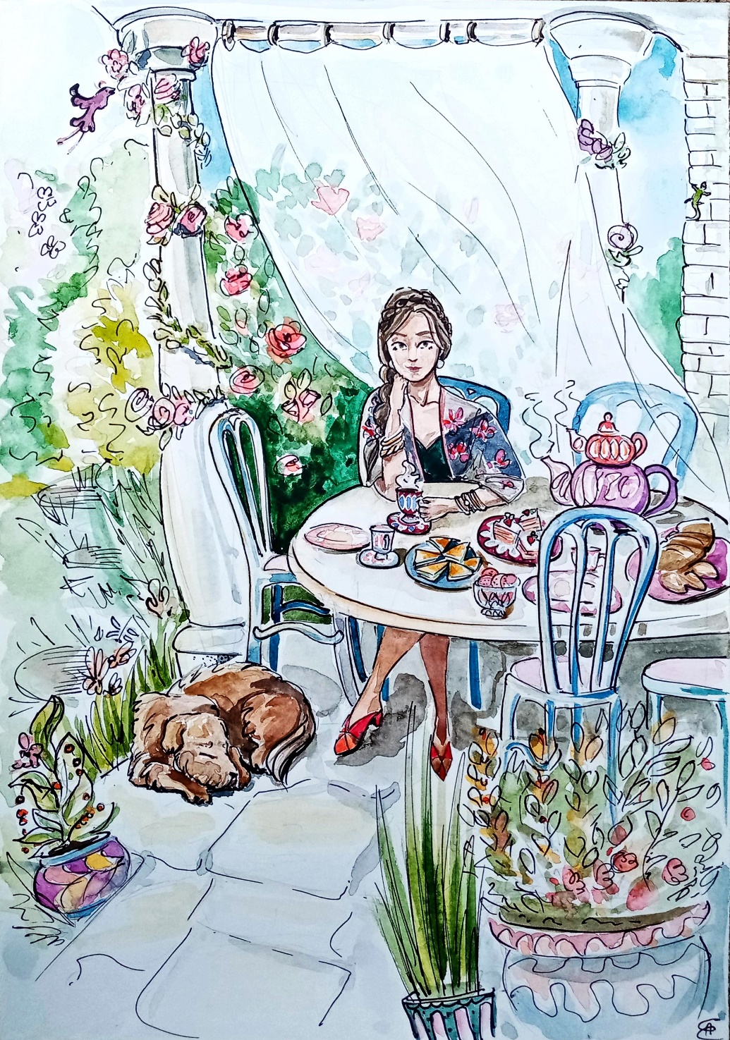 Они вышли через кухню на улицу, и оказались на веранде в конце которой стоял небольшой круглый стол уставленный угощениями. За ним сидела молодая девушка и любопытно глядела на Марко. Она была маленькой и фигуристой, ее кожа отличалась смуглостью, а черные густые волосы были заплетены во всевозможные косички и уложены в прическу. Одета она была в яркое платье на восточный манер, словно экзотическая птичка, но несмотря на жаркую погоду, царившую снаружи, на её плечах была накинута шаль. Выполнив свою задачу, безэмоциональная девушка скрылась из виду.