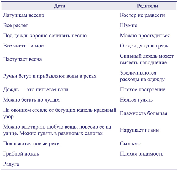 Особый интерес у ребят на занятиях в детском саду вызывает игра, в которой группа делится на две команды: одна «Хорошо», другая «Плохо». Тут уж идет соревнование на то, кто больше назовет качеств. Взрослые тоже могут участвовать в игре. Дети (или ребенок) называют положительные качества, взрослый отрицательные, и наоборот. В состязании «взрослый ребенок» обогащается не только ребенок, но и взрослый. Мы даже и не подозревали, насколько изобретательны дети. Например, взяли слово «дождь» не самое простое, но всем хорошо знакомое. Как правило, в таких состязаниях побеждают дети. Они более раскованны и свободны в своих фантазиях. Судите сами.