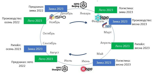 На рис.7 видно, как подстраиваются к системам предзаказов важные компоненты маркетинговой инфраструктуры рынка спортивных товаров выставки. Самая авторитетная среди них ispo проводится в Мюнхене, Пекине и Шанхае во время, близкое к сессиям предзаказов. И если крупные поставщики проводят их самостоятельно, то многие небольшие и средние компании индустрии пользуются возможностями ispo.