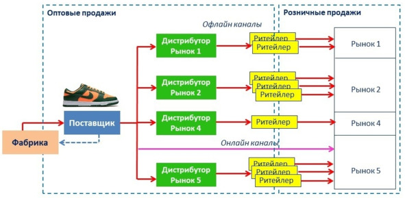 Процесс разработки отдельной модели или товарной линейки поставщиком всегда связан с размещением заказа на выбранной фабрике, распределением произведенных товаров между дистрибуторами, а затем и между ритейлерами. Предметом этих отношений являются крупные партии спортивных товаров, именно оптовые сделки позволяют обеспечить рынки необходимым объемом продукции.