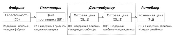 Розничные и оптовые цены на один и тот же товар отличаются, диапазон между ними может составлять 50500%, что объясняется разным объемом затрат на производство, маретинга и доставку товара, а также уровнем спроса на него. Каждый участник цепочки ценностей включает на своем этапе в цену товара свои издержки, прибыль и скидки (рис. 6), и все эти усилия оценивают покупатели.