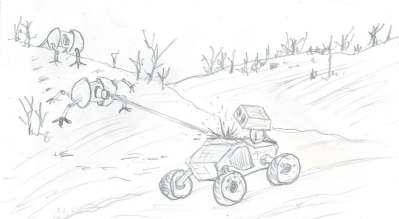 Два легких и быстрых броне-квадробота, лихо перепрыгивая с холма на холм, летя во весь опор, выскочили на очередное предгорье, чтоб получить визуальное подтверждение на АРЛ станцию. Необходимы были точные координаты для артиллерии, которая уже изготовилась на позиции, чтоб нанести удар. «Квадроботы» не остались незамеченными для группы из 5-и «Гиен», которые лихо перескакивая через низкие кустарники, обрушились на легкобронированные машины своими излучателями.