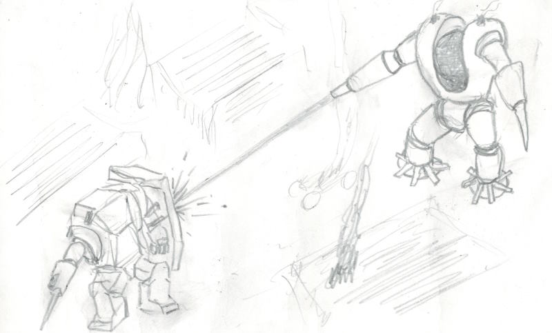 Средний излучатель «Гладиатора», выдав мощный поток энергии, лизнул тонкую броню сзади и готов был прикончить вражескую машину. Однако «Охотник» в какой-то момент словно инстинктивно почувствовал опасность и резко взмыл в небо. Луч прочертил лишь небольшую борозду от торса до правой ноги робота не причинив тому серьёзного вреда. «Эх, я дурак! Надо было разогнаться и термо-ударным копьем бить! Ну, сейчас ты просто обязан ударить меня ракетами. Ну же!». Два мощных взрыва в небе ответили на его вопрос. Обе коробки РПУ на плечах «Охотника» детонировали одновременно, отправив робота в неуправляемое пике. Однако пилот был профессионалом своего дела. У самого грунта он подловил машину и совершил посадку на колено. Почти одновременно с этим он вскинул тяжелый пульсар и разрядил его в «Гладиатора».