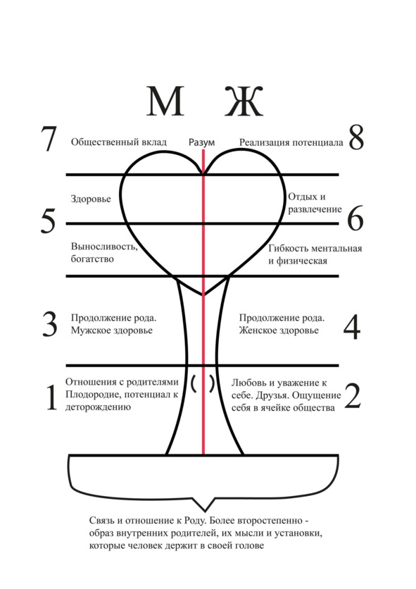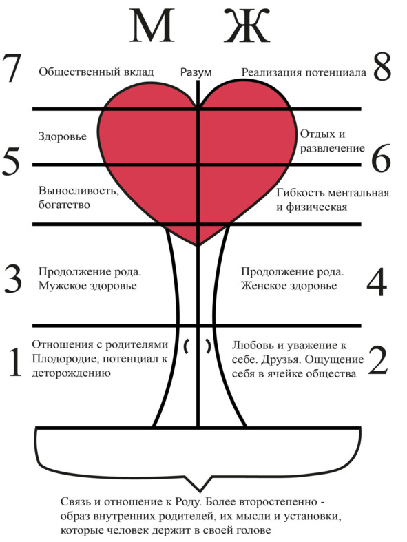 Буква «М» на рисунке обозначает мужское начало, «Ж» женское. Эти обозначения нужны, чтобы определить в каком полюсе находятся сферы жизни, и как они проявляются. Ваша деятельность в каждой из сфер определяет уровень удовлетворённости в ней. Давайте рассмотрим каждую сферу жизни подробнее, чтобы было общее понимание, как можно анализировать и исцелять себя.