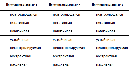 Благодаря этому упражнению вы впервые взглянули на свои негативные ментальные вторжения со стороны. В процессе работы с этой тетрадью у вас может возникнуть желание изменить свои записи, сделанные в шаге 2. Если вы столкнулись со сложностями при выполнении прошлого упражнения, то с помощью следующего чек-листа вы сможете дать более глубокую оценку своим негативным мыслям и чувствам.