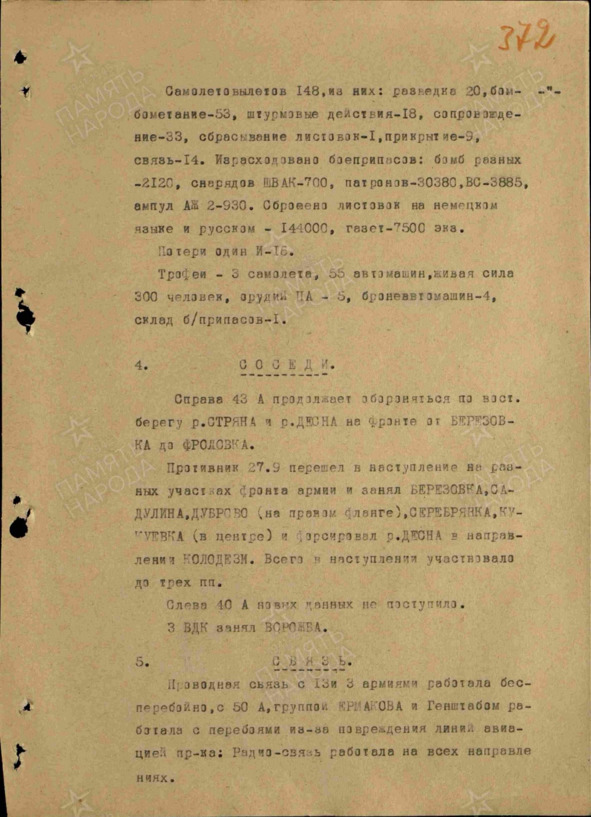 За 26 сентября уничтожено 98 немецких самолётов. Наши потери 31 самолёт. Наши суда Северного флота потопили два транспорта противника водоизмещением в 8 тысяч и 5 тысяч тонн.
