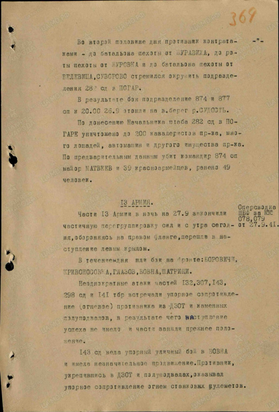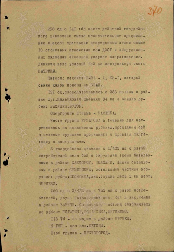 Воспользовавшись полученной информацией, командование дивизией произвело ночной налёт в два часа ночи. В результате двадцать седьмого сентября был освобождён Погар, Граборовк и Куровка. Правда, в результате массированной контратаки, наши части были вынуждены к исходу дня вернуться на исходные позиции.