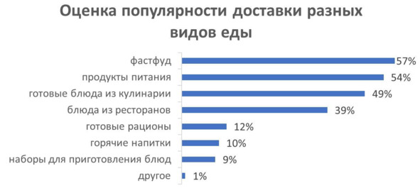 Существует ещё один вариант, но он касается не столько непосредственно организации службы доставки, сколько в целом бизнеса по доставке. По данным исследования сервиса romir.ru от 23.06.2022 доставкой готовой еды и продуктов питания регулярно пользуются 70% россиян. Наиболее популярна доставка фастфуда (57%), продуктов питания (54%), готовых блюд из кулинарии (49%) и блюд из ресторанов (39%).