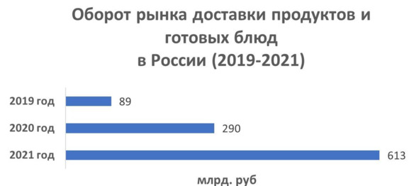 Давайте посмотрим, как увеличился спрос на доставку в период с 2019 по 2020 гг. По данным «Анализа рынка доставки готовых блюд и продуктов в России», подготовленного BusinesStat в 2022 г., наибольший прирост объема рынка доставки продуктов и готовых блюд пришелся на 2020 г. первый год пандемии (225%). Такой быстрый рост был связан с закрытием заведений общественного питания и общим режимом самоизоляции в течение нескольких месяцев. По итогам 2021 г. объем рынка достиг 613 млрд рублей.