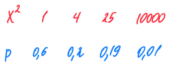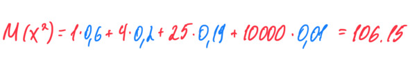 Какой вывод я могу сделать? Второе математическое ожидание гораздо больше первого. Почему? Потому что в первом случае я умножал вероятность 0,01 на 100, а во втором ту же вероятность 0,01 я умножил уже на 10000. Это позволило «лучше учесть влияние на математическое ожидание того возможного значения, которое велико и имеет малую вероятность» (Гмурман, 98). В зависимости от количества подобных величин, того, насколько они «маленькие», может потребоваться возведение не только в квадрат, но и в более высокие степени.