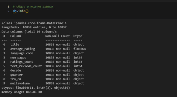 Так я изучаю характеристики каждого набора данных. Замечаю, что в num_pages, ratings_count, text_reviews_count есть странности. Так, например, среднее в num_pages составляет 344, но максимальное значение 6576. Говоря иначе, в среднем в одной книге 344 страницы, но есть книга, у которой 6576 страниц. Это может свидетельствовать о выбросах в данных. Непосредственно о выбросах я расскажу позже, но уже сейчас надо это учитывать. Если я предполагаю, что в моем наборе данных есть выбросы, то я могу использовать робастные, то есть устойчивые к выбросам методы оценки среднего. Я могу найти такую оценку с помощью библиотеки papanda.