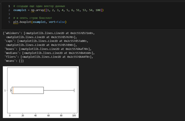 Что здесь произошло? Я создал второй вектор, где заменил 7, 8, 9, 10 на 51, 53, 54, 100. Количество значений не изменилось. Не изменилась и сама медиана она осталась 5.5. Однако линия медианы «прижалась» к левой стороне ящика. Почему?