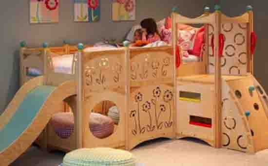 Ещё одна тенденция насыщение интерьера детской комнаты игровыми элементами позаимствованными на детских площадках в первую очередь это горки и различные конструкции для лазания. Чаще всего эти элементы комбинируются с самой масштабной и устойчивой мебельной конструкцией двухъярусной кроватью.