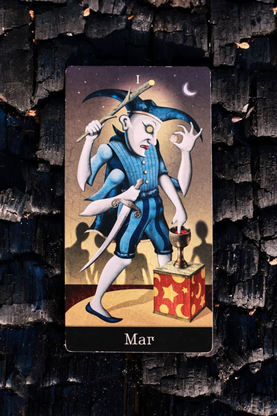 Действие сюжета карты происходит в цирке перед нами выступление Мага (а может быть, фокусника?). И опять же: у главного героя костюм в полоску и головной убор, очень похожий на шутовской колпак. Именно такая расцветка одежды была обязательной для шутов, жонглеров и других маргинальных личностей в Европе в конце Средневековья. У нашего героя четыре руки «почетный» артист цирка уродов.