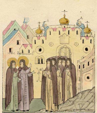 Смерть Даниила Чёрного и Андрея Рублёва. Миниатюра из "Жития Сергия Радонежского". 1592 год.