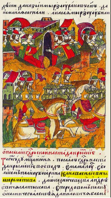 Страница из Лицевого летописного свода, где говорится о походе против крымцев в 1555 году, в котором большим полком командовали Иван Васильевич Шереметев и окольничий Лев Андреевич Салтыков.