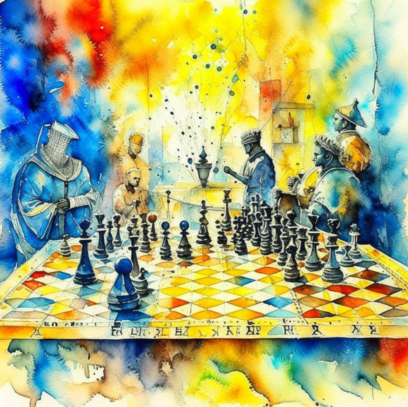 Когда обе армии, наконец, были полностью собраны, началось величайшее в истории шахматного мира сражение. Тысяча людей наблюдали эту грандиозную битву. Полководцы разрабатывали все новые тактики войны. Мчавшиеся с ветром ладьи-колесницы стремительно сносили храбрых воинов противника. Огромные слоны грандиозно шествовали по полю битвы, внушая врагу ужас.
