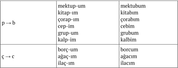 2. некоторые слова, состоящие из одного слога, и остаточные слова (слова иностранного происхождения): at (лошадь) atım, et (мясо) etim, pilot (пилот) pilotum, saç (волосы) saçım, saat (часы) ) saatim, vakit (время) vaktim, suç (вина) suçum, maç (матч) maçim, süt (молоко) sütüm, топ (мяч) topum др.