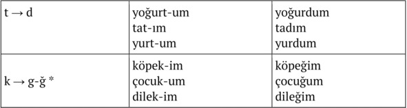 Ещё один важный момент в этом разделе, который нужно знать для того, чтобы говорить на турецком как носитель языка. Если последняя гласная в слове совпадает с гласной в аффиксе, то эта гласная в основе слова может убираться (выпадать). Тогда слово звучит гармоничнее. Исключение 3-е лицо мн. числа.