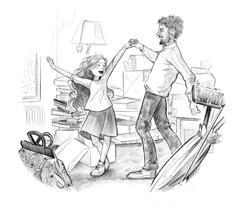 Они кружились среди картонных коробок, и папа старался придать своему лицу серьёзное выражение, как у настоящего танцора. Ива повторяла за папой.