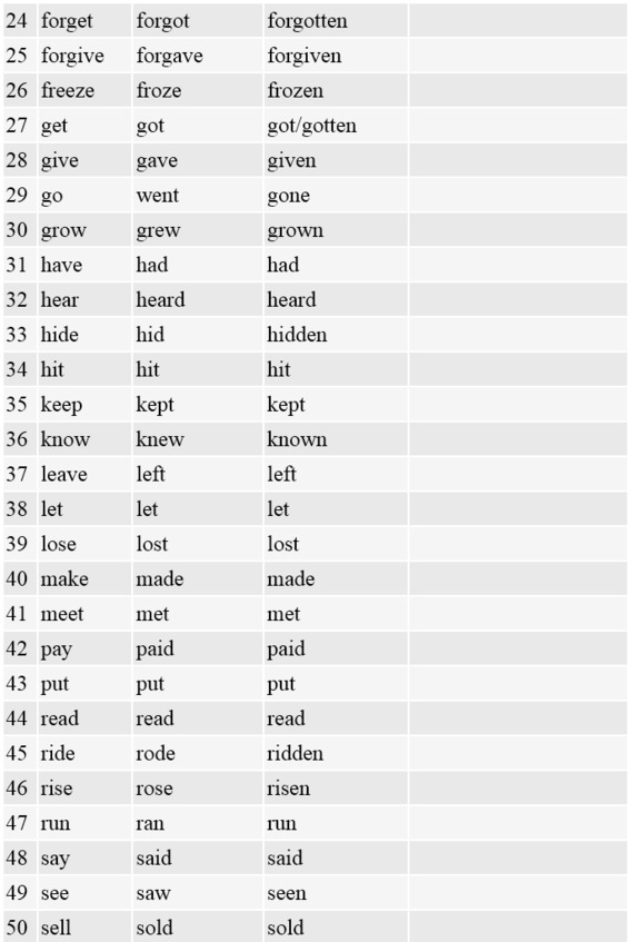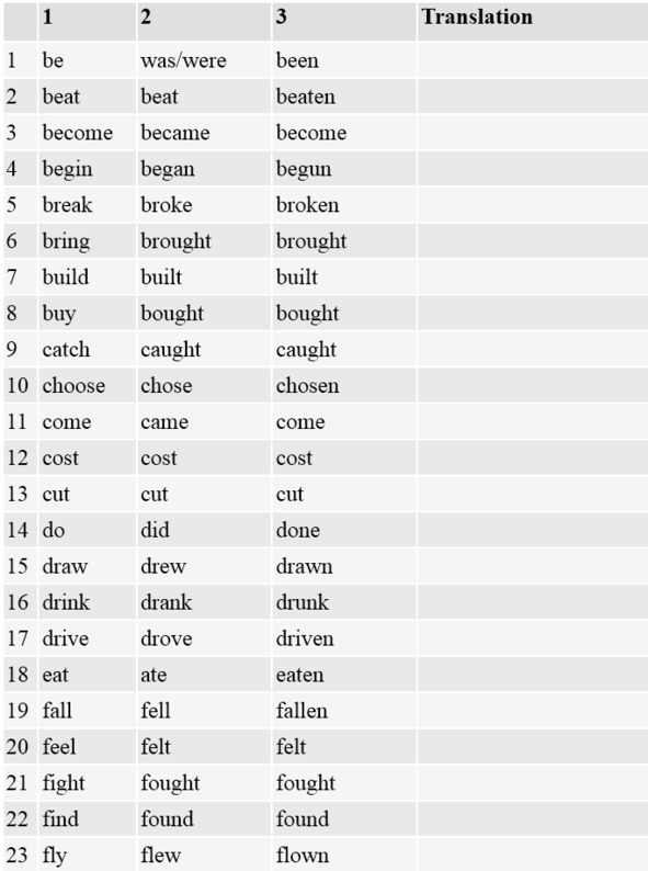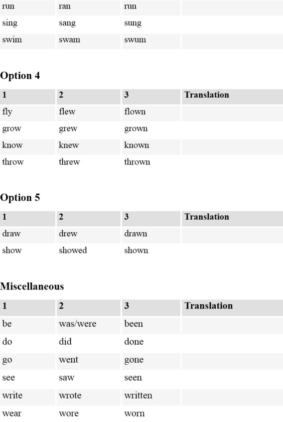 1. Mini TablesStudy the following groups of irregular verbs2. Irregular Verbs Table (75 verbs)