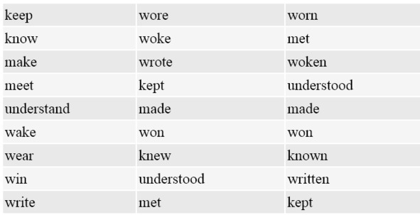 to know, to bring, to make, to cut, to read, to send, to give, to wear, to spend, to sing